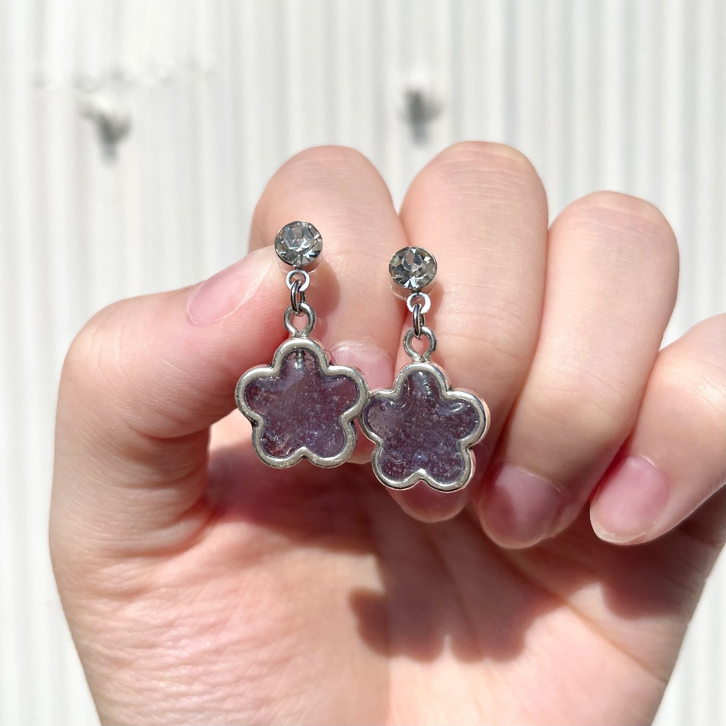 硬めの液を使用しているため他のフラワーパーツよりもぷっくりしているのが特徴!!ちゅるんちゅるんで可愛らしい透明感たっぷりのピアスです!