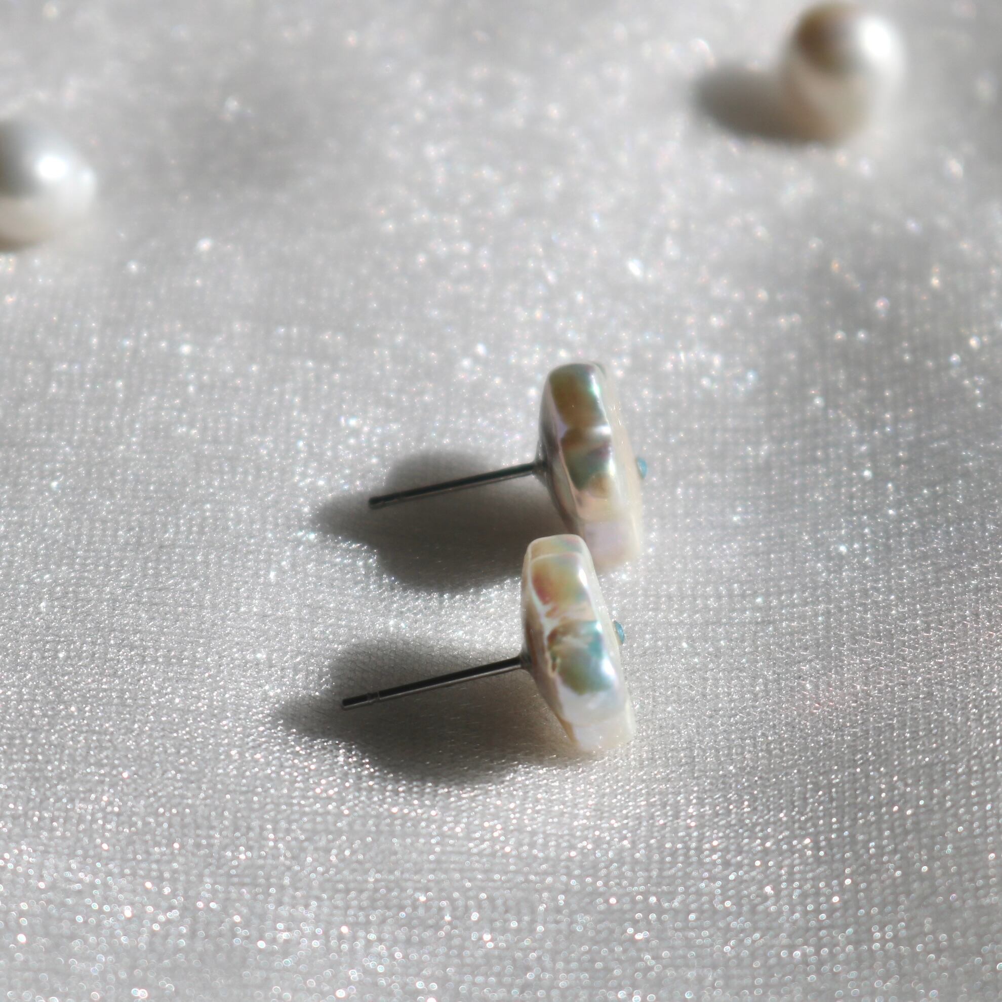 お花形のパールに水色のストーンをつけたピアスです